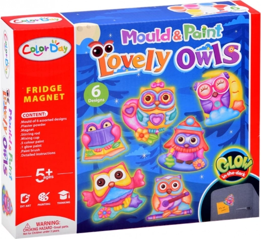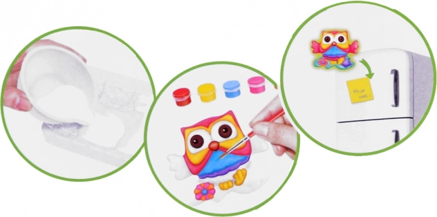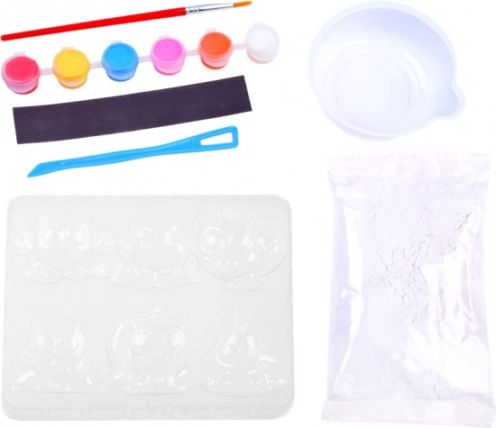 Nella confezione trovi tutto il necessario: stampo con motivi di gufi, polvere di gesso, bicchierino per miscelare, spatola/coltello a paletta, pennello, 6 colori e striscia magnetica. Grazie ai passaggi chiari, il set è adatto anche ai principianti ed è un’ottima idea regalo.