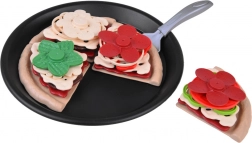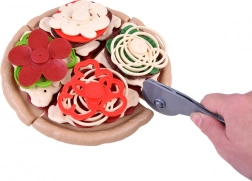 La pizza è divisa in spicchi e può essere facilmente “tagliata” con la rotella di plastica. I bambini allenano la motricità fine e vivono una preparazione realistica del pasto.