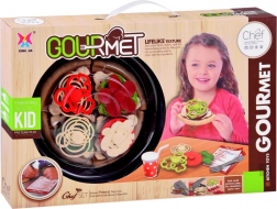 Con questo ricco set i bambini compongono la loro pizza preferita, la servono nel piatto oppure la confezionano nella scatola “da asporto”. Grazie agli spicchi e agli accessori realistici allenano la coordinazione mano-occhio e si divertono un mondo in cucina.