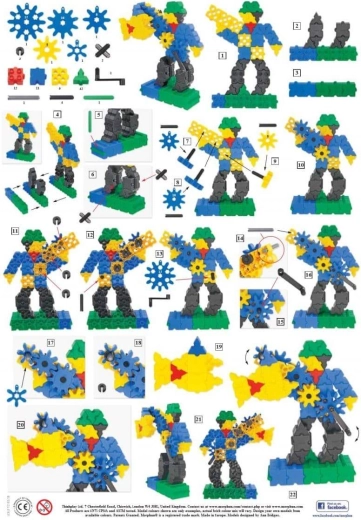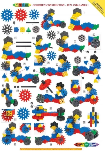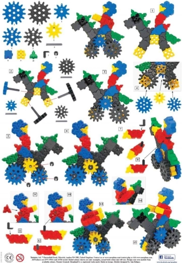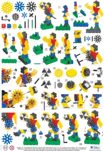 - Quadrati, triangoli, ingranaggi (5 dimensioni), manovelle, connettori; istruzioni illustrate A4 (4 pagine)