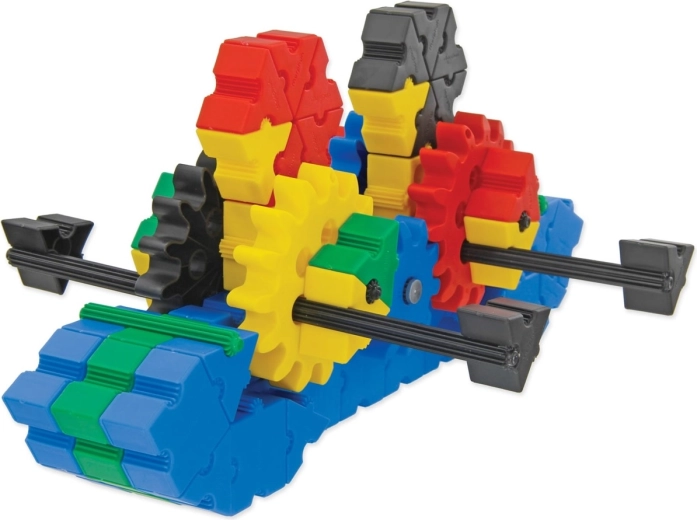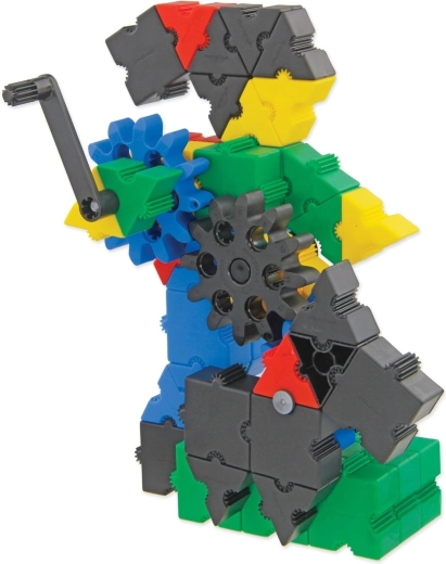 Grazie a cinque dimensioni di ruote e alle manovelle, i bambini mettono facilmente in movimento le loro creazioni e comprendono i principi di trasmissione e trasferimento della forza.