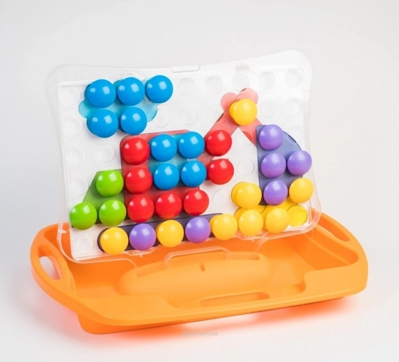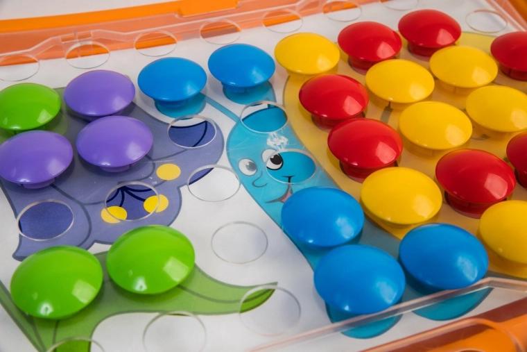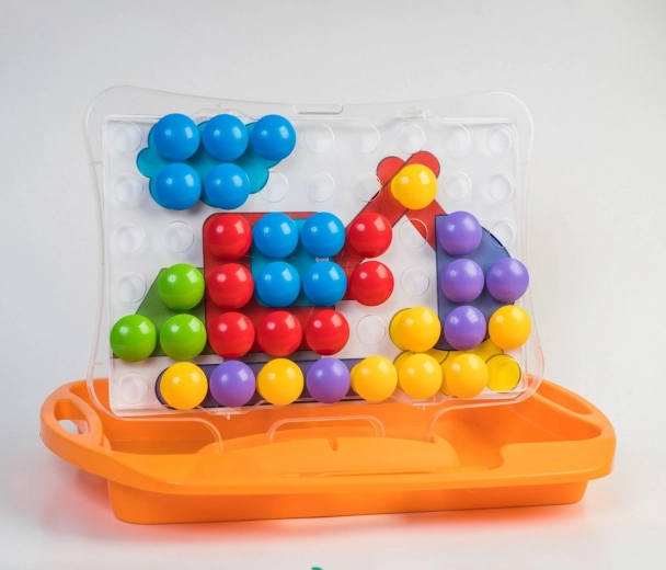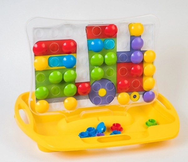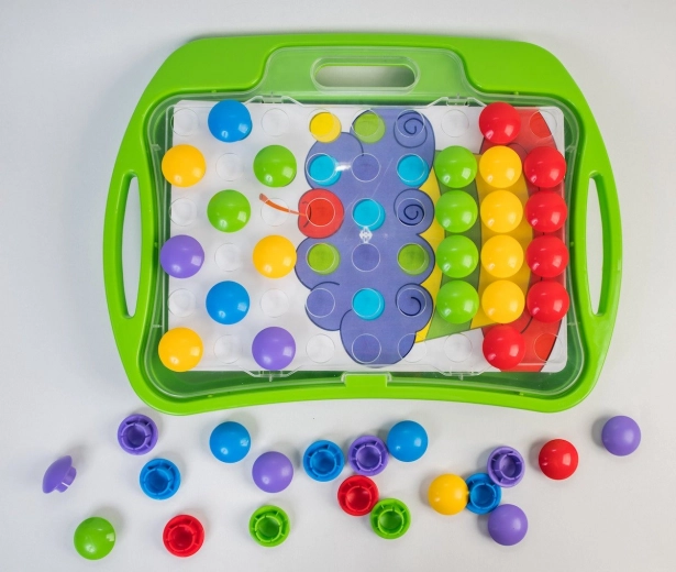 Il mosaico educativo è progettato per stimolare la creatività e lo sviluppo della motricità fine nei bambini. È composto da 54 elementi colorati a forma di "funghetti", che possono essere inseriti nei fori della base per creare composizioni uniche.