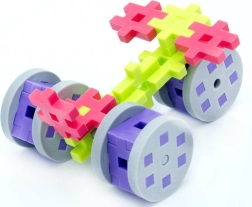 Il set include ruote e assi grazie ai quali i bambini costruiscono auto mobili e altre creazioni tecniche che sviluppano motricità e logica.