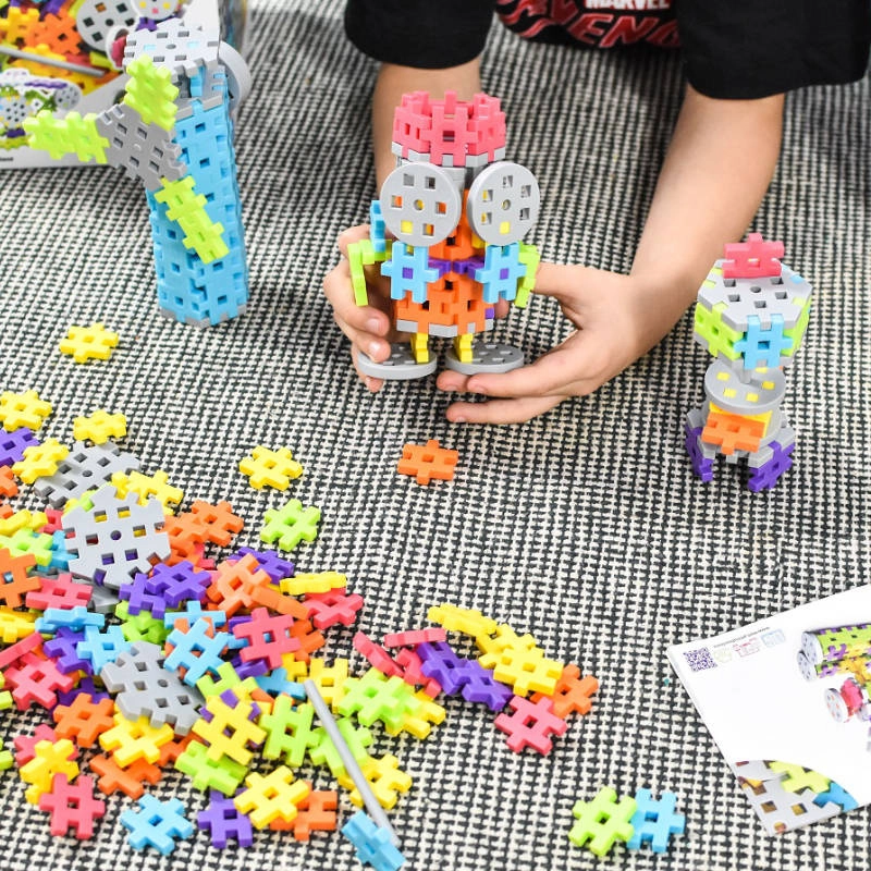 I pezzi colorati a forma di croci e connettori si incastrano facilmente. Il libretto di istruzioni incluso ispira nuovi modelli e costruzioni.