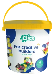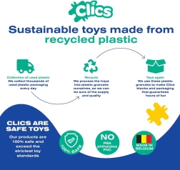 I CLICS sono prodotti in Belgio con materiali certificati e hanno vinto numerosi premi internazionali. Grazie alla loro robustezza, i modelli sono funzionali e pronti per il gioco: le auto corrono, le eliche girano e le figurine si muovono. Il secchiello è pratico sia per riporre che per trasportare.