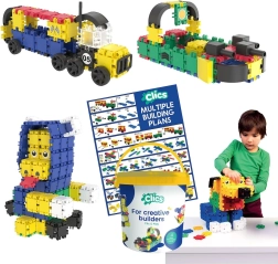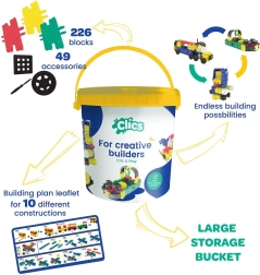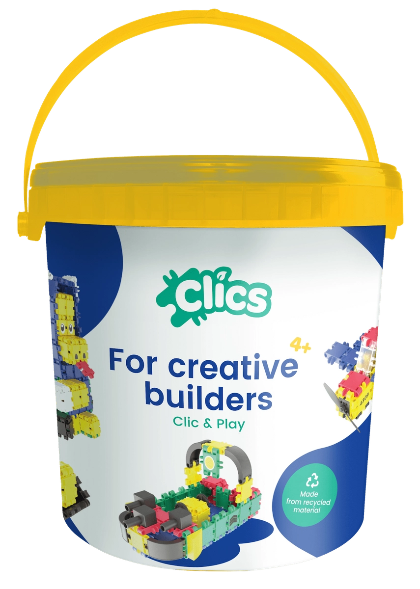 Scopri il set creativo di costruzioni CLICS in secchiello con 275 pezzi e modelli 10 in 1. I grandi elementi a scatto 5 × 5 cm si uniscono facilmente e sviluppano fantasia, motricità fine e pensiero logico. Costruisci veicoli, animaletti e modelli 2D/3D e goditi ore di divertimento con pezzi sicuri e di qualità, prodotti in Belgio.