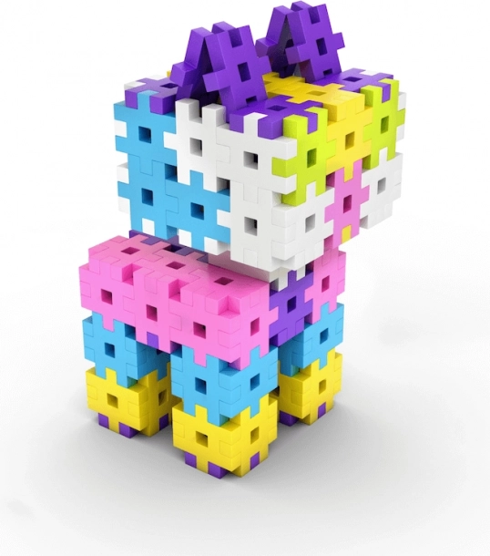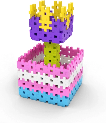 Il kit sviluppa presa, coordinazione mano-occhio e immaginazione. La palette pastello, con prevalenza di rosa e viola, motiva i bambini a creare. È inclusa una librettina con idee che ispira nuovi modelli; per strutture ancora più stabili è possibile aggiungere una base.