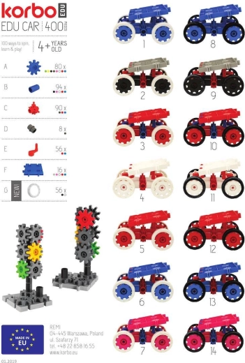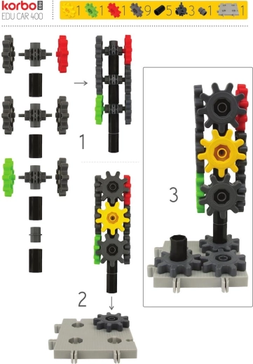 Korbo sono set di costruzione creativi con ingranaggi, dove non basta solo l'intuizione - è necessario un pensiero logico creativo. Sono realizzati con materiali sicuri della massima qualità, confezionati in belle scatole di cartone o plastica e sono un complemento ideale per la cameretta dei piccoli costruttori. Le infinite possibilità di costruzione di modelli tridimensionali sviluppano e divertono i bambini di tutte le età. I meccanismi di ingranaggi mobili favoriscono la comprensione dei principi della meccanica e allo stesso tempo sviluppano la percezione spaziale e la motricità fine. Le costruzioni Korbo non sono solo un giocattolo, ma soprattutto una combinazione di strumenti didattici e buon divertimento. I bambini le scelgono con entusiasmo - perché offrono sfide e lunghi momenti di gioco interessante. I modelli progressivi sono una sfida e la quantità di possibilità consente ai bambini di tutte le età di trovare la propria idea per trascorrere il tempo in modo particolarmente creativo. Tutti i componenti si collegano facilmente e i modelli sono resistenti e mobili.