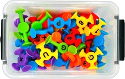 Il set aderisce tra sé e a superfici lisce come finestre, piastrelle o la vasca da bagno, così il divertimento può spostarsi dalla cameretta anche in bagno. Tutto è riposto in una scatola trasparente con manico per un facile trasporto e una pratica conservazione.