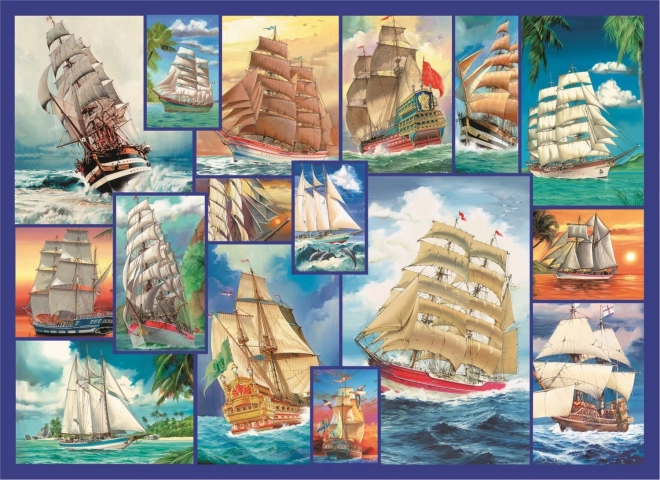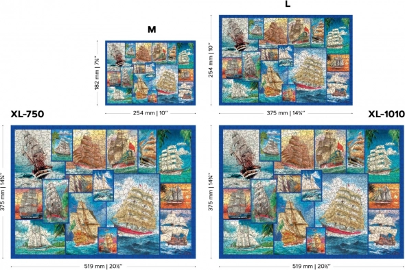 Possibilità di montare il puzzle sia in base all'immagine che alla forma, con un tema di velieri su un lato e un motivo ricorrente sull'altro.