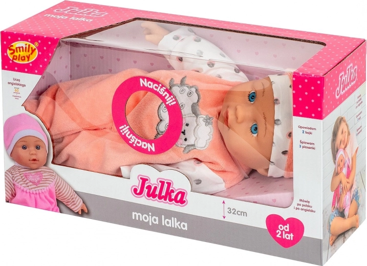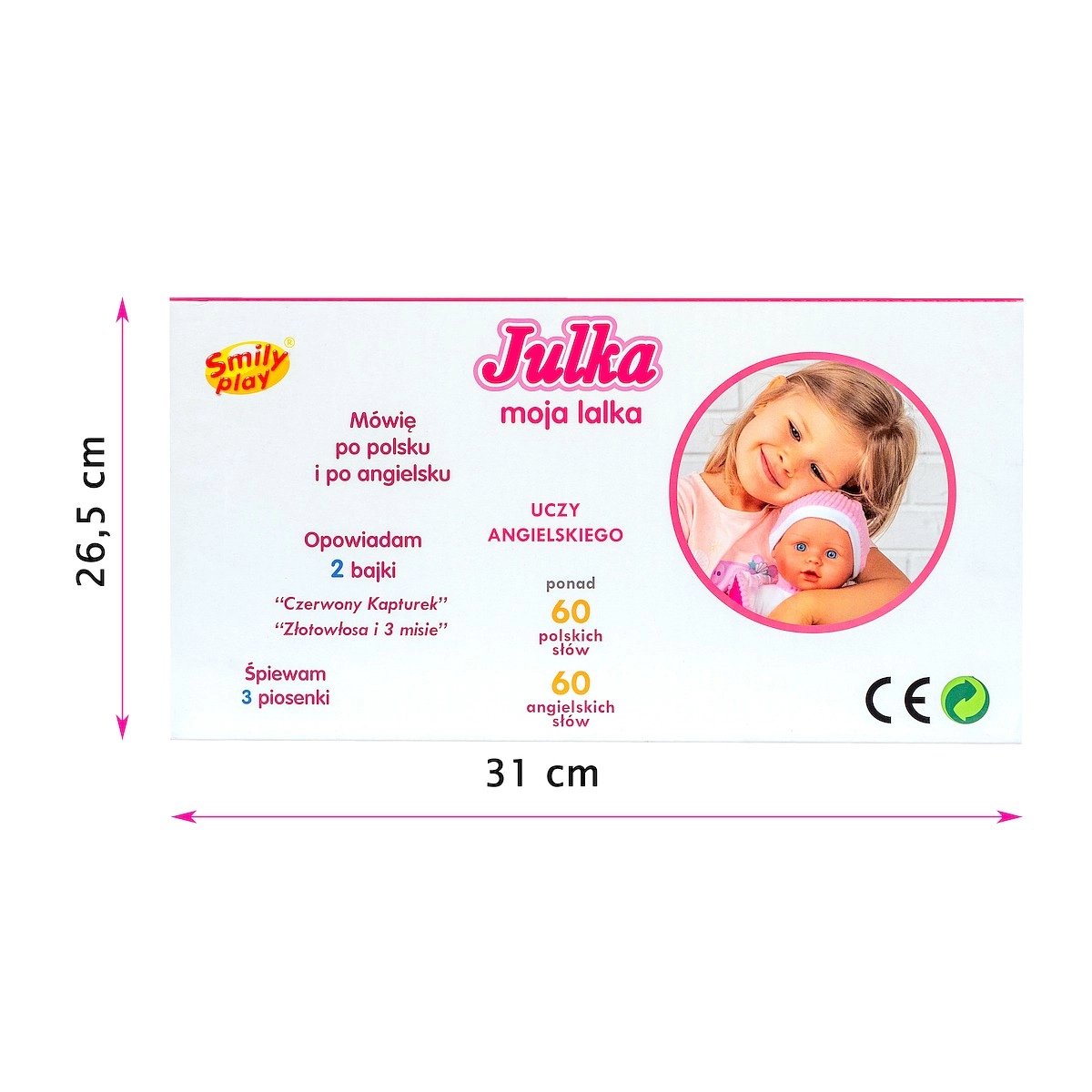 Cercate la prima bambola con cui il bambino non solo giochi, ma impari anche qualcosa? La bambola bebè parlante Julka motiva a una cura dolce, sviluppa le abilità sociali e guida naturalmente alla scoperta di una lingua straniera. Il vestitino morbido, i materiali piacevoli e i dettagli adorabili rendono Julka un’amica amata sia per il passeggino sia per la nanna.