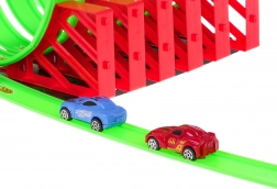 Le macchinine sono composte da due segmenti mobili, così si adattano perfettamente alla forma della pista e restano in traiettoria nelle curve senza uscire. Il montaggio è semplice, ti guida un manuale chiaro stampato sulla confezione, e lo stile finale è completato da adesivi decorativi.