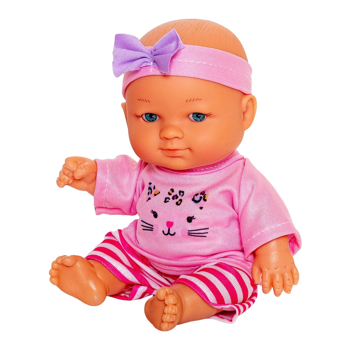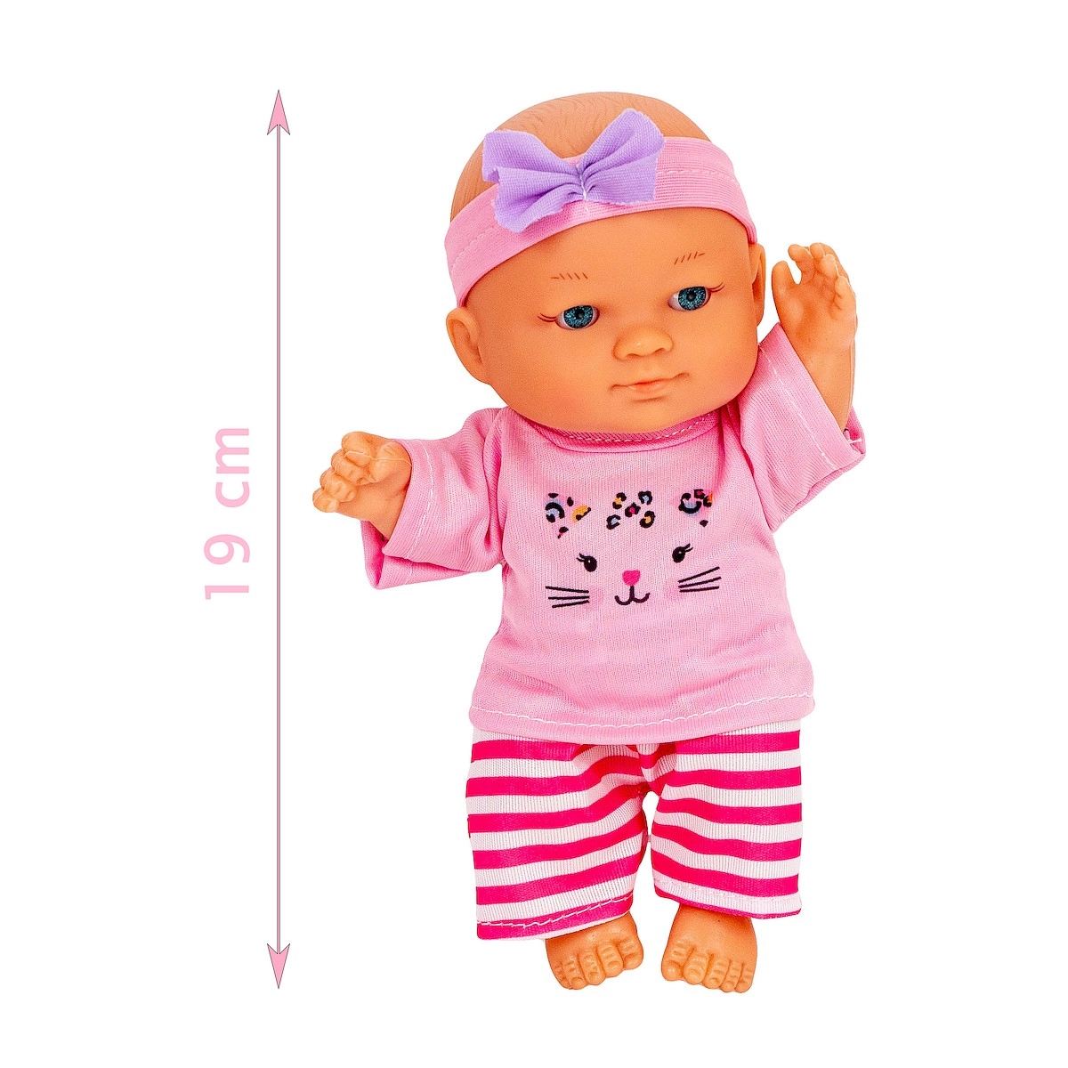 Julka indossa un top rosa con stampa di gattina, leggings a righe e cerchietto con fiocco – facile da cambiare e perfetto per il gioco di fantasia.