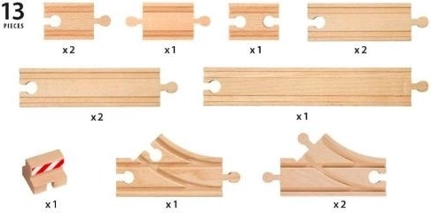 Elementi dritti, curvi e di collegamento permettono di creare percorsi vari e di ampliare la ferrovia in legno secondo la fantasia.