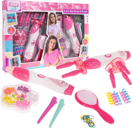 - macchina per intrecciare i capelli, - 2 punte intercambiabili per intrecciare i capelli in treccia e per intrecciare due ciocche, .- applicatore di perline per capelli, .- spazzola per capelli, .- scatolina per perline, .- 76 perline multicolori, .- 2 x molletta per capelli, .- 5 forcine, .- 2 x manuale, uno per ciascun dispositivo, .- 20 x elastico per capelli. . |