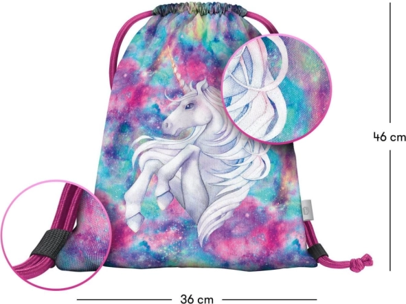 La stilosa sacca Baagl con motivo Unicorno è ideale per pantofole, attrezzatura sportiva o piccoli oggetti. Offre un materiale robusto e lavabile e una pratica chiusura a coulisse, che consente anche un comodo trasporto sulla schiena.