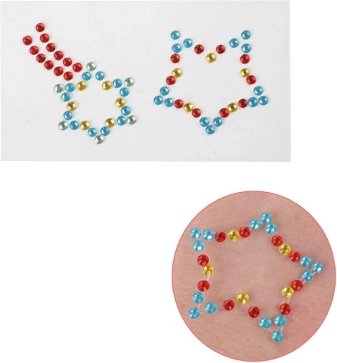 Decorazioni adesive con strass aggiungono un tocco di brillantezza al risultato. Si applicano facilmente e completano alla perfezione tatuaggi e motivi timbrati.
