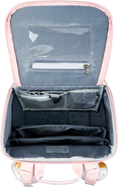 Il sistema di apertura a ribalta, l’organizer interno con elastico, la tasca trasparente per l’orario e la tasca frontale isolata sono perfetti per merenda e piccoli oggetti.