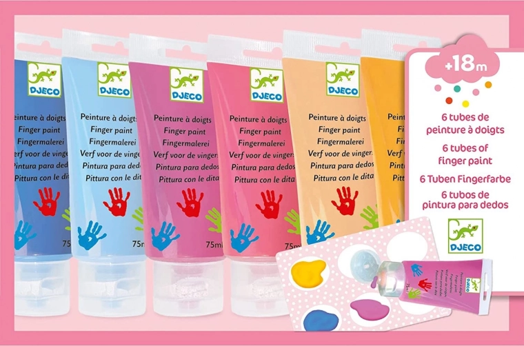 Set di 6 colori a dita in tonalità pastello per piccoli artisti, perfetti per i primi disegni e creazioni. I colori sono facilmente lavabili e removibili, quindi lavare le mani e i vestiti sporchi sarà un gioco da ragazzi. I tubetti si aprono e si chiudono con facilità. Il set contiene: 6 tubetti di colori a dita (ognuno da 75 ml) e una tavolozza di plastica.
