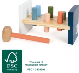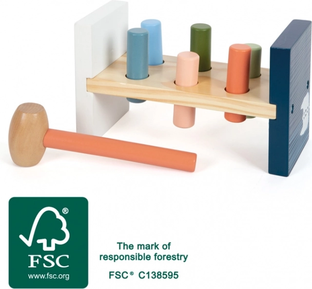 Questa panca da martellare di alta qualità in legno FSC® 100% è ideale per le prime abilità dei piccoli costruttori. I bambini usano il martelletto in legno per battere i cilindri colorati nella panca e, una volta terminato, riavviano facilmente il gioco con una semplice rotazione. La stampa laterale con l’orso polare ha senso visivo anche giocando a testa in giù.