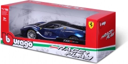 Modello da collezione Bburago Ferrari FXX-K Evo in scala 1:18, realizzato con parti in metallo e plastica, porte e cofano apribili e ruote anteriori sterzanti. L’elegante livrea blu-nera e gli interni e vano motore dettagliati lo rendono un elemento di spicco in qualsiasi vetrina.