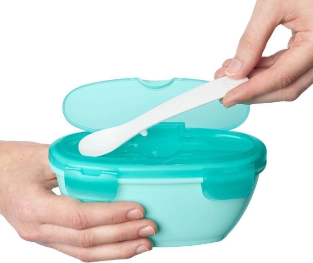 Cucchiaino progettato appositamente per inserirsi nel coperchio, per un'alimentazione comoda.
