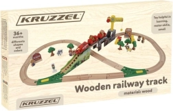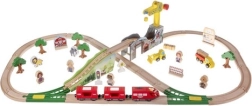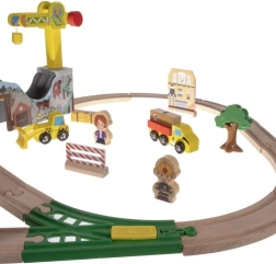 Questa ricca pista ferroviaria in legno offre ai bambini ore di gioco creativo. I pezzi sono levigati e colorati con vernici sicure. I convogli si uniscono con magneti potenti, rimanendo compatti anche quando vengono sollevati. Il set è completato da gru, ponti, segnali stradali, alberi, edifici e veicoli da lavoro: tutto il necessario per scene variegate.