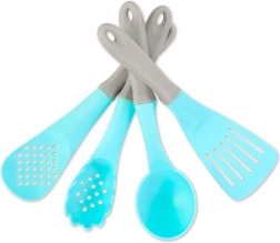 Il set di cucchiaio, mestolo, spatola e forchetta da servizio è ideale per una “cottura” antiaderente e un gioco sicuro senza spigoli vivi.