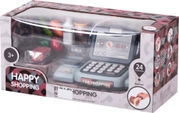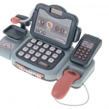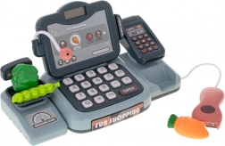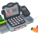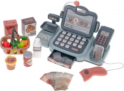 Oltre al registratore di cassa, il set è dotato di bilancia, lettore di carte, scanner di codici a barre, microfono, carta colorata, contanti, cestino e imitazioni di alimenti come bevande, verdure e altro.
