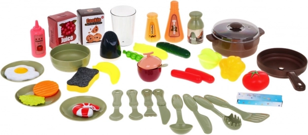 42 pezzi di accessori vari, tra cui piatti, ciotole, posate e cibi simulati, offrono infinite possibilità di gioco.