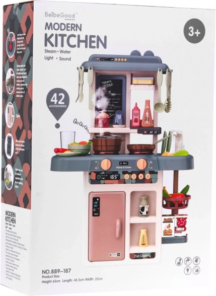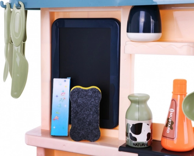 Il set include anche un'ampia gamma di accessori, tra cui una lavagna per appunti, pentole con coperchio, padelle, piatti, posate, cibi simulati come verdura e frutta, e molto altro. La sua struttura stabile e colori pastello assicurano non solo divertimento, ma anche un'esperienza estetica.