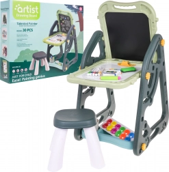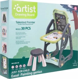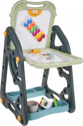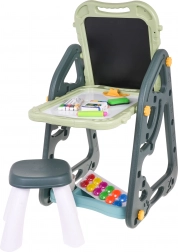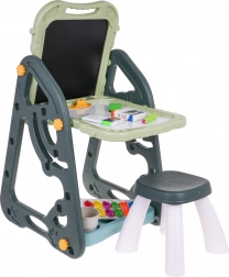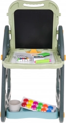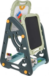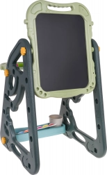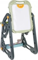 Il grande set multifunzionale è composto da due lavagne: una a gesso e una magnetica, insieme a uno sgabello comodo, è la scelta ideale per bambini dai 3 anni in su. Offre la possibilità di impostare le lavagne in due posizioni: da un lato magnetica, dall'altro a gesso, o come tavolino con superficie per disegnare. Sul lato bianco è possibile scrivere con pennarelli o fissare magneti colorati, mentre il lato nero è destinato al disegno con gesso. Il set include anche due mensole per materiali artistici.