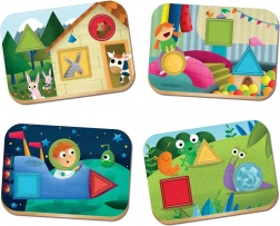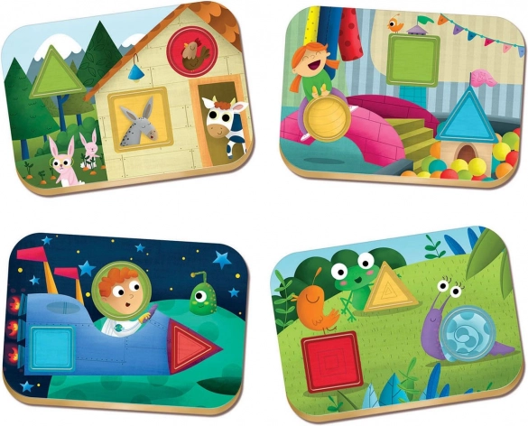 Questo gioco migliora l'attenzione dei bambini, stimola la loro immaginazione e insegna loro a riconoscere le forme geometriche e i colori di base in diversi ambienti: in fattoria, nella sala giochi, nel prato e nello spazio.