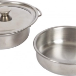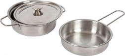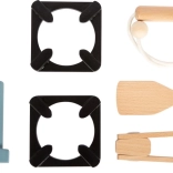 Il set include tutto il necessario per una piccola spedizione culinaria: padella, pentola con coperchio, pinze da grill, spatola in legno, strofinaccio da cucina e 2 fogli di cartone con alimenti/ingredienti. Grazie alle dimensioni compatte e alla maniglia in corda è ideale per viaggi, cameretta e giardino.