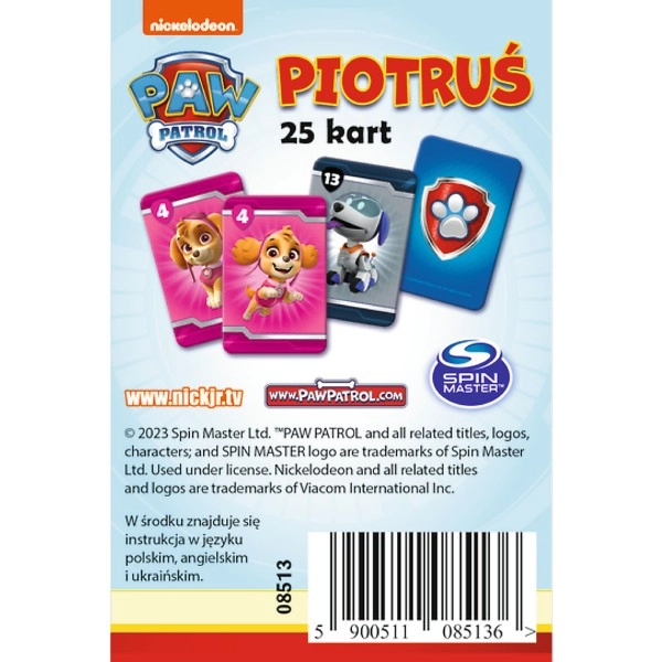 Gioco di carte Piotruś con tema PAW PATROL del marchio Trefl porta un gioco veloce e divertente per bambini dai 4 anni. Regole semplici, personaggi preferiti e sviluppo di attenzione e concentrazione rendono questo gioco una scelta perfetta per momenti in famiglia e viaggi.