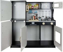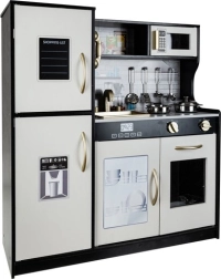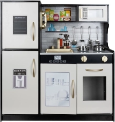L’elegante cucina XL in legno di KRUZZEL, in nero, bianco e oro, offre ai bambini un gioco di cucina realistico. Include illuminazione LED, effetti sonori dei bruciatori, elementi interattivi e un ricco set di accessori incluso (pentola, padella, coperchio, 4 utensili). Lavello estraibile, forno, microonde e armadietti a “clic” stimolano creatività, apprendimento attraverso il gioco e role play.
