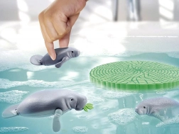Un lamantino adulto e due cuccioli ispirano alla cura degli animali, all’alimentazione e all’osservazione nell’ambiente acquatico.