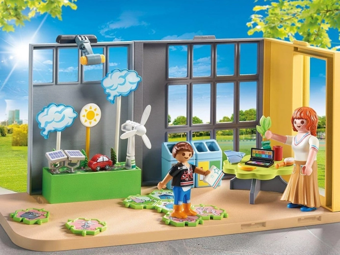 Sono inclusi bidoni per la raccolta differenziata, piante, decorazioni ecologiche, elementi di infrastruttura “verde” e attrezzature scolastiche. Il set è compatibile con altri set PLAYMOBIL (ad es. ampliamenti delle aule), così da integrarlo facilmente in un mondo scolastico più ampio.