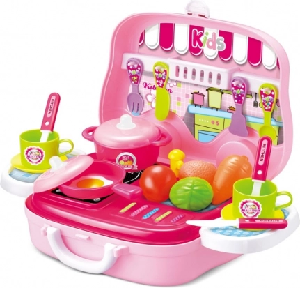 Pratico set da cucina per piccole cuoche in valigetta a forma di macchinina offre un gioco divertente con 25 accessori, facilmente smontabili ed espandibili.
