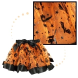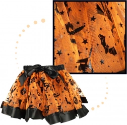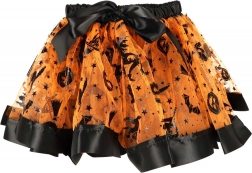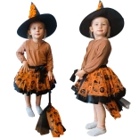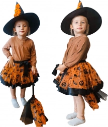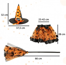 Questo costume da strega in 3 pezzi trasforma ogni bambino in una piccola maga. La leggera gonna tutu con vita elastica è comoda per un uso prolungato, il cappello a punta alto dona un tocco magico al look e la scopa completa perfettamente il personaggio. L'arancione con motivi neri di pipistrelli, zucche e stelle è vivace e fotogenico.