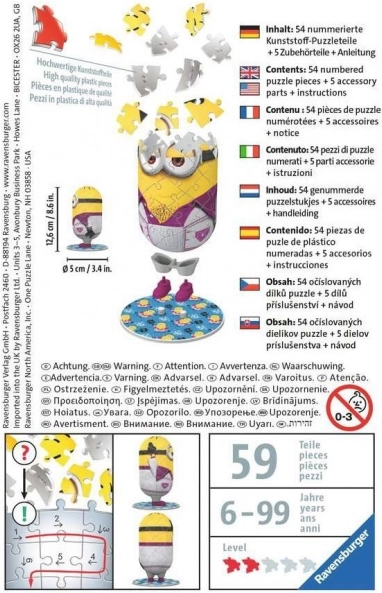 Divertiti a assemblare il puzzle 3D con il personaggio di Minion, che offre un grande divertimento per tutta la famiglia.