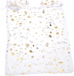 Questo sacchetto natalizio in organza è la scelta perfetta per confezionare con stile piccoli regali. Grazie al suo design trasparente con motivo a stelle, aggiunge eleganza e festività a ogni dono. Scegli tra la variante dorata o argentea e decora il tuo Natale con eleganza.
