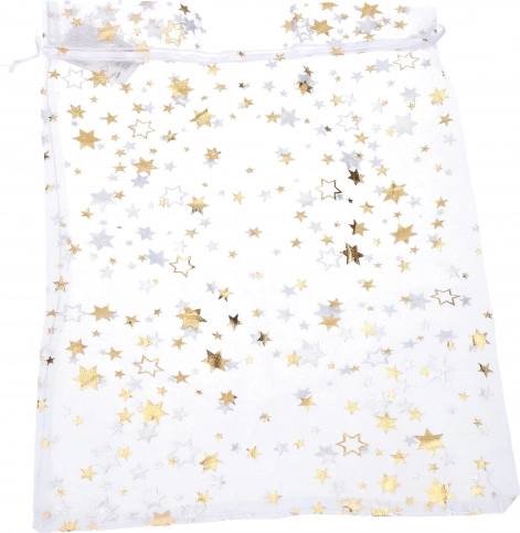 Elegante sacchetto natalizio in organza 25x35 cm con stelle, disponibile in oro e argento.