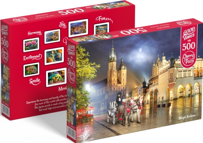 Immergetevi nella bellezza pittoresca della storica città di Cracovia attraverso questo dettagliato puzzle. Disegnate l'eccezionale decorazione della città con i 500 pezzi lavorati con precisione che offrono non solo divertimento, ma anche un'esperienza estetica.