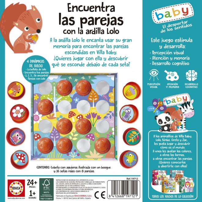 EDUCA Baby Trova le coppie con lo scoiattolo Lolo è un gioco educativo che aiuta i bambini dai 24 mesi a sviluppare la memoria, la motricità e la creatività attraverso la ricerca di immagini abbinate.
