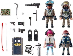 - Set di 37 pezzi con figure di polizia, comprendente quattro personaggi PLAYMOBIL, tre membri della task force Tactic e una criminale, bombola da sub, casco, GPS, piede di porco e molta attrezzatura speciale per inseguimenti d’azione nella cameretta.