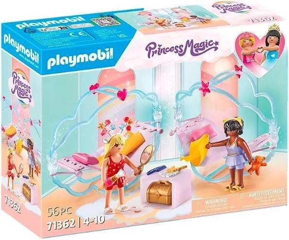 Goditi l'avventura con le principesse arcobaleno alla festa del pigiama celeste PLAYMOBIL. Prima che le due principesse arcobaleno si corichino nei loro letti magici oscillanti, le adornano con gioielli scintillanti, poi viaggiano nel mondo dei sogni e delle illusioni con personaggi fiabeschi ed ambienti magici.