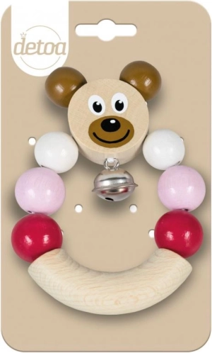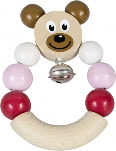 Sonaglio in legno con orsetto di colore rosa. Facile da afferrare, il campanellino tintinna delicatamente.