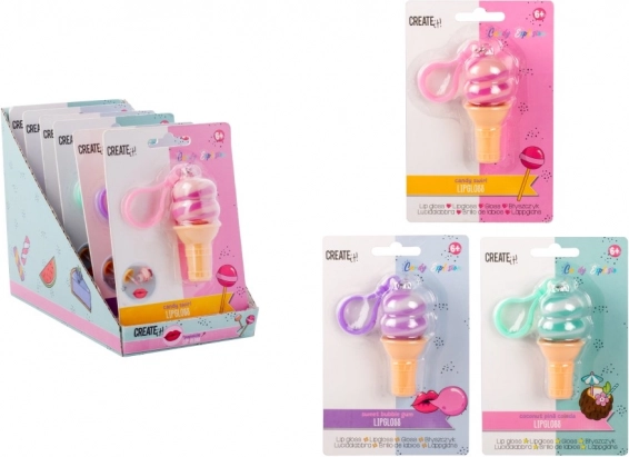 Dolcissimo lucidalabbra a forma di cono gelato che funge anche da portachiavi. Disponibile in tre varianti di colore e tre gusti, ideale per ravvivare rapidamente le labbra e come accessorio alla moda per borsa o chiavi.