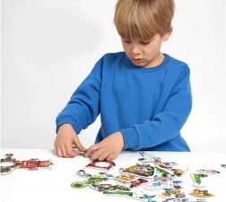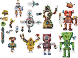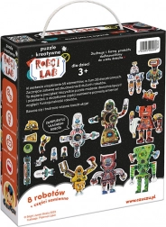 Il puzzle creativo Robot Lab offre infinite possibilità di combinazione. La base è composta da 63 pezzi di qualità, lucidi e fustellati con precisione, che grazie alla forma intelligente e alle illustrazioni si abbinano perfettamente. I bambini assemblano prima 8 grandi robot e poi, grazie alle parti “di ricambio”, ne modificano l’aspetto – oppure creano personaggi e macchine completamente nuovi.